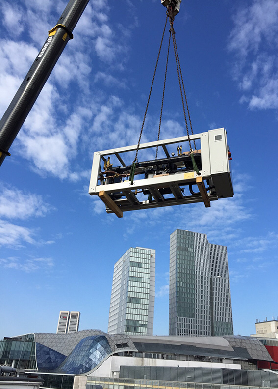 Im Rahmen eines spektakulären Kraneinsatzes wurden am Sonntag dem 11.10.2015 in der Frankfurter Innenstadt die Kälteanlagen in die Klimazentrale des Nobelhauses eingebracht.